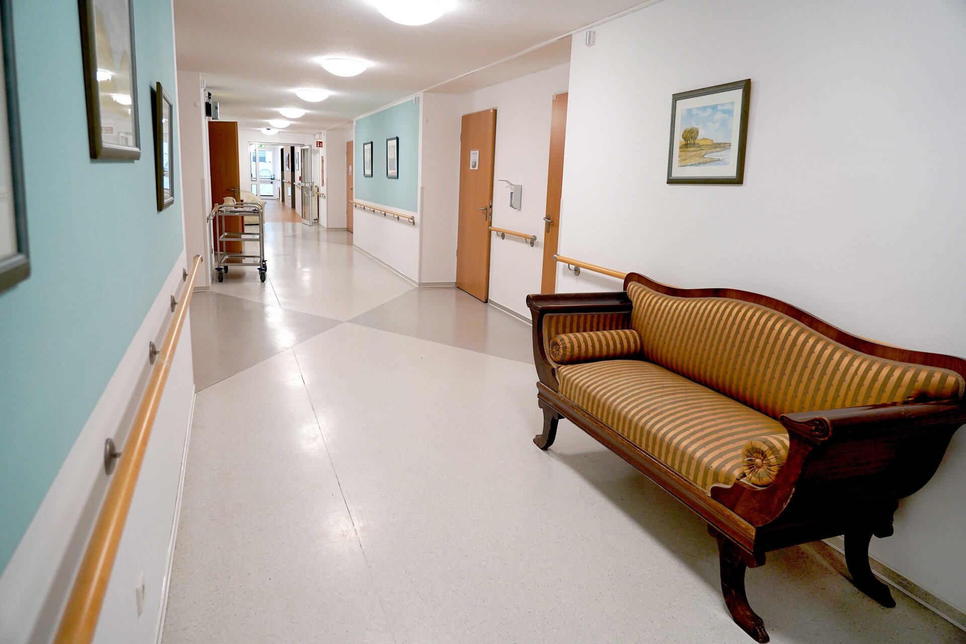 Der Wohnbereich 2 bietet in erster Linie Einzelzimmer. Hier liegt der Schwerpunkt neben der palliativen Pflege auf der Versorgung und Betreuung von somatisch Erkrankten und Menschen mit Behinderungen.