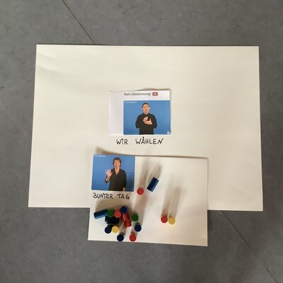 Zur Wahl standen: Freunde-Tag, Tausch-Tag, Kuddel-Muddel-Tag und Bunter-Tag. Mit 16 von 32 Stimmen gewann der bunte Tag. Statt Wahlzetteln nutzten die Kinder Stecker, die sie ihrem Favoriten zuordnen konnten. So wurde die Wahl nicht nur spannend, sondern auch anschaulich – und die Kinder erlebten hautnah, was demokratisches Handeln bedeutet.